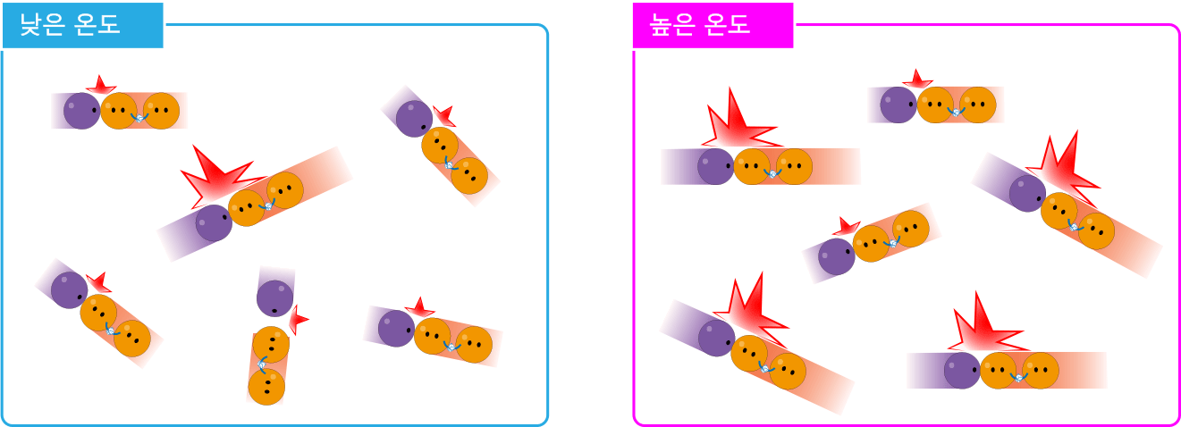 ¿Âµµ°¡ ¿Ã¶ó°¡¸é ¹ÝÀÀ ¼Óµµ°¡ Ä¿Áö´Â ´õ Áß¿äÇÑ ÀÌÀ¯´Â Ȱ¼ºÈ ¿¡³ÊÁö(* ÂüÁ¶: ºü¸¥ ¹ÝÀÀ°ú ´À¸° ¹ÝÀÀ : Ȱ¼ºÈ ¿¡³ÊÁö)¿Í °ü°è°¡ ÀÖ½À´Ï´Ù. ¿Âµµ°¡ ¿Ã¶ó°¡ ¹ÝÀÀ¹° ÀÔÀÚµéÀÌ ´õ ºü¸£°Ô ¿îµ¿ÇÏ¸ç ´õ Å« ¿îµ¿¿¡³ÊÁö¸¦ °®°Ô µË´Ï´Ù. ±× °á°ú Ȱ¼ºÈ ¿¡³ÊÁö ÀÌ»óÀ» °®´Â Ãæµ¹ÀÌ ´õ ¸¹¾ÆÁö¹Ç·Î, ¹ÝÀÀ ¼Óµµ°¡ Ä¿Áý´Ï´Ù.